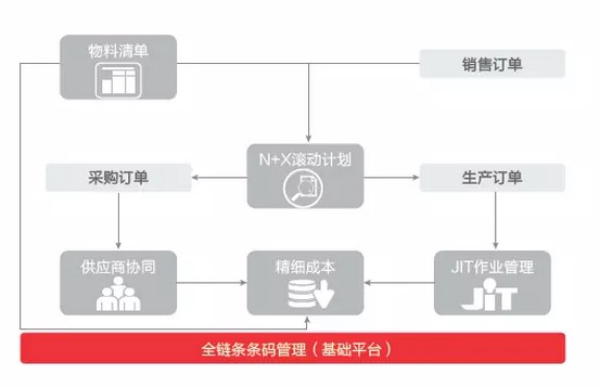 概括來講,所謂的智能生產(chǎn)管理模式,就是從接到銷售訂單,到根據(jù)銷售訂單編制發(fā)貨計劃,企業(yè)內(nèi)部的N+5滾動計劃,上線計劃、組織訂單、采購訂單,生產(chǎn)訂單,采購訂單同時進入供應(yīng)商協(xié)同平臺,生產(chǎn)訂單只是到工序,然后完成調(diào)撥,產(chǎn)成品入庫,以及管理到我們銷售發(fā)貨,應(yīng)收帳款。整個流程中,條碼貫穿到每個關(guān)鍵點的管理。通過這種管理模式,給我們的效率和業(yè)務(wù)的準確度帶來很大的提升,實現(xiàn)了我們智能制造的預(yù)期目標。