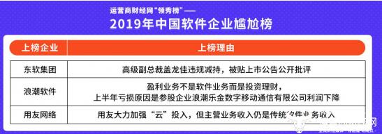 近日,運(yùn)營商財(cái)經(jīng)網(wǎng)推出了“2019年中國軟件企業(yè)尷尬榜”,盤點(diǎn)2019年中國軟件企業(yè)發(fā)生的尷尬事件。其中用友網(wǎng)絡(luò)因在大力加強(qiáng)“云”投入后,主營業(yè)務(wù)收入仍是依靠傳統(tǒng)軟件業(yè)務(wù)營收而登上此榜。